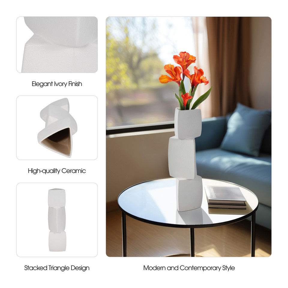 20" Stacked Triangle Rough Vase,ivory